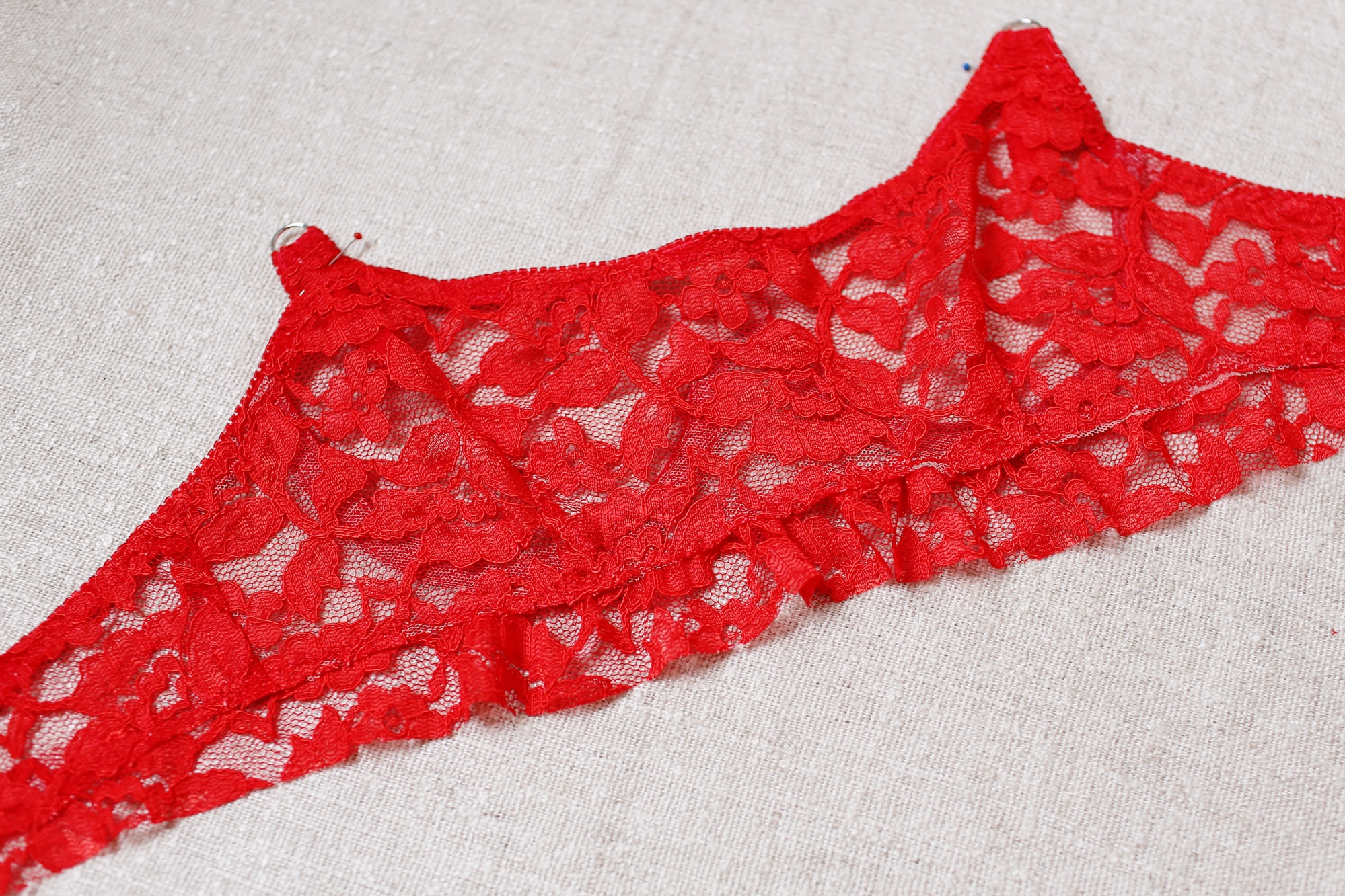 There was so much experimentation going on with this bralette. First, it is made entirely with a rigid lace (Zero stretch in the length and about 2% mechanical stretch on the cross). It is a bra making rule to always use a stretch fabric for the back band to allow the bra to stretch for breathing/movement. In theory, I get it, but I have seen many high end RTW bras use non stretch lace all over. One of my current favorites, which you’ve probably spotted on the pegboard at my studio, is Morgan Lane’s Annicka bra. Seriously, I’m obsessed. I was able to get my hands on a sample and although the lace is more sheer than the one I used, it had no stretch.