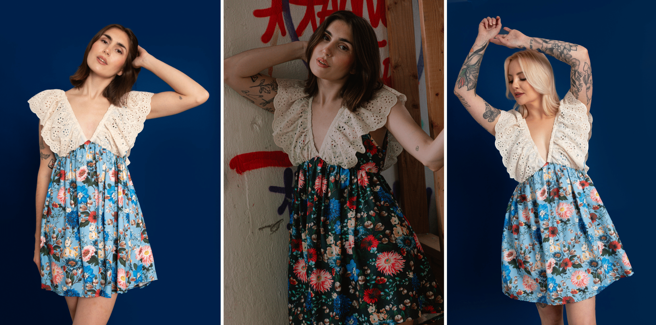 Chic, breezy, and beginner-friendly, the Olivet dress + blouse style is a beginner-friendly sewing project that has simple construction and easy-to-follow steps. It is available in sizes XS-5X with a full sew along on Madalynne’s YouTube channel. Whether you’re new to sewing or an experienced maker looking for a quick me-made project, it’s a satisfying and stylish choice with exaggerated puff sleeves, a deep V-neckline in the front and back, and a gathered skirt. There were no alterations to the sewing of these sample.