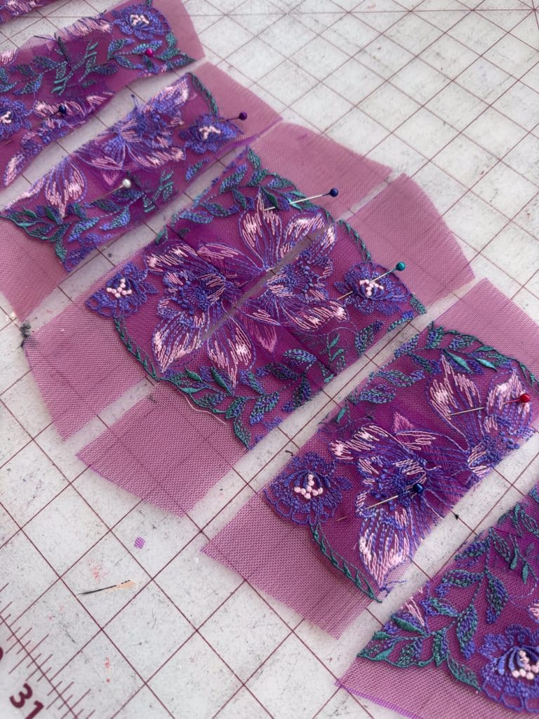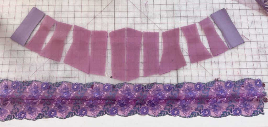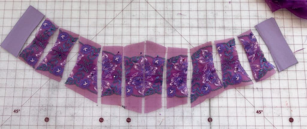 Two: Cut two strips of non stretch gallon lace. The length should be the slightly longer than the waspie. The width depends on how wide you want the lace overlay to be. Sew the two strips together. Press seams open and then lay on top (right side) of all Annabelle pattern pieces except for the center back. The seam on the lace strip should align with the waistline. Pin in place. Then cut the lace strips for each pattern piece.
