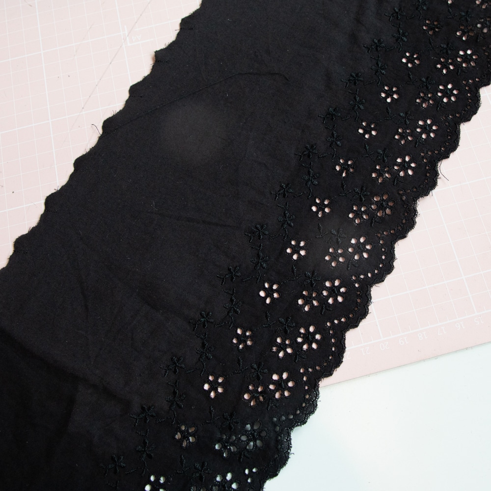This black cotton eyelet lace trim features delicate floral embroidery and a classic scalloped edge. Crafted from soft, breathable cotton, the tiny cut-out eyelets create a charming effect, ideal for hemlines, lingerie, sleeve edges, or summer dress details.