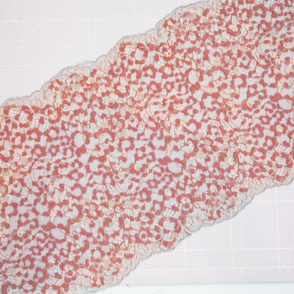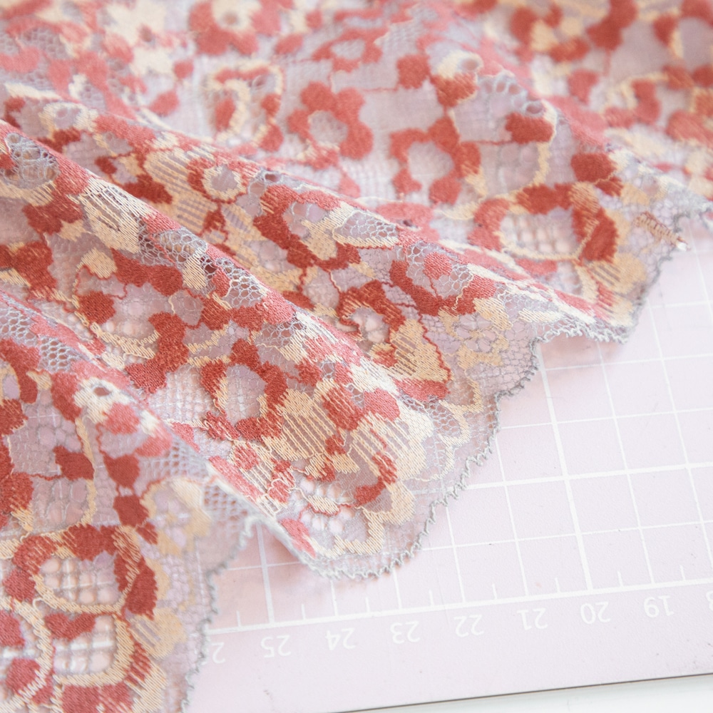 This stretch galloon lace has a copper and golden yellow print with a delicate scalloped edge. A blend of nylon and spandex, it is perfect for projects that need a little bit of stretch.
