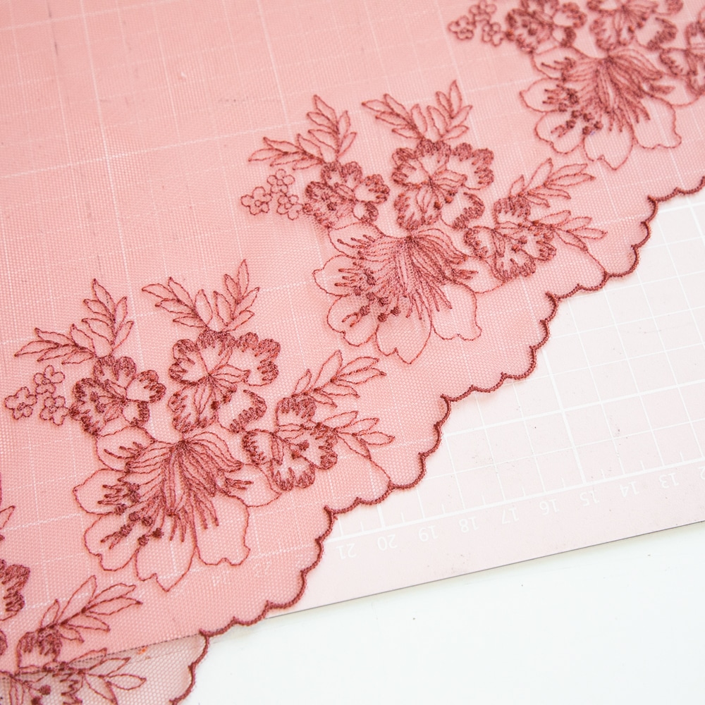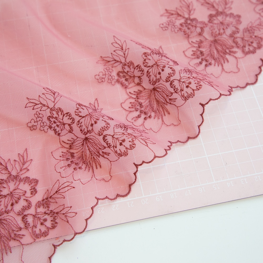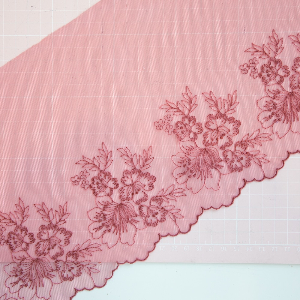 This embroidered tulle lace has sheer tulle base with a delicate floral embroidered scalloped edge. The scalloped edge features an embroidered floral design outlined in deep dusty rose thread. It has a soft hand feel, make it perfect for unlined lingerie.