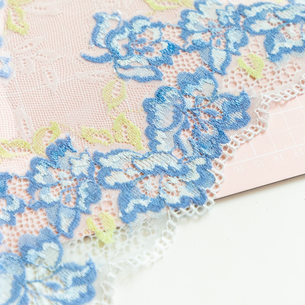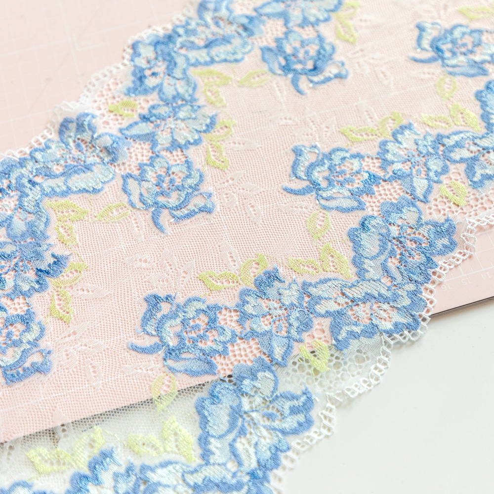 This stretch galloon lace features soft blue florals with chartreuse, set against a white mesh base. Perfect for bralettes, panties, bodysuits, or even accent detail on lingerie.