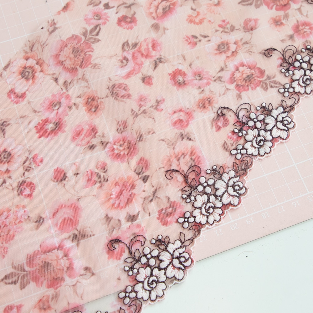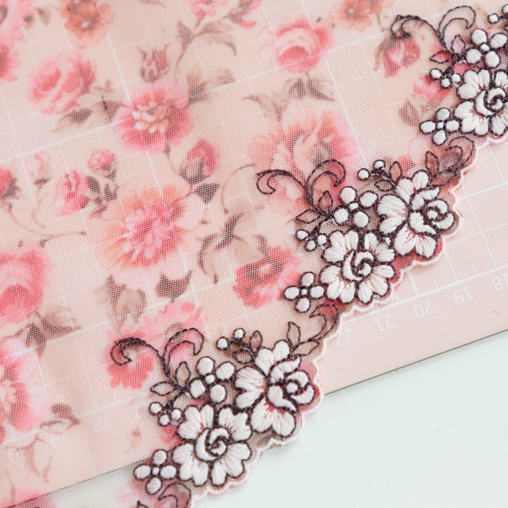 This embroidered tulle lace has sheer tulle base with a romantic rose print. The scalloped edge features an embroidered floral design outlined in black thread. It has a soft hand feel, make it perfect for unlined lingerie.