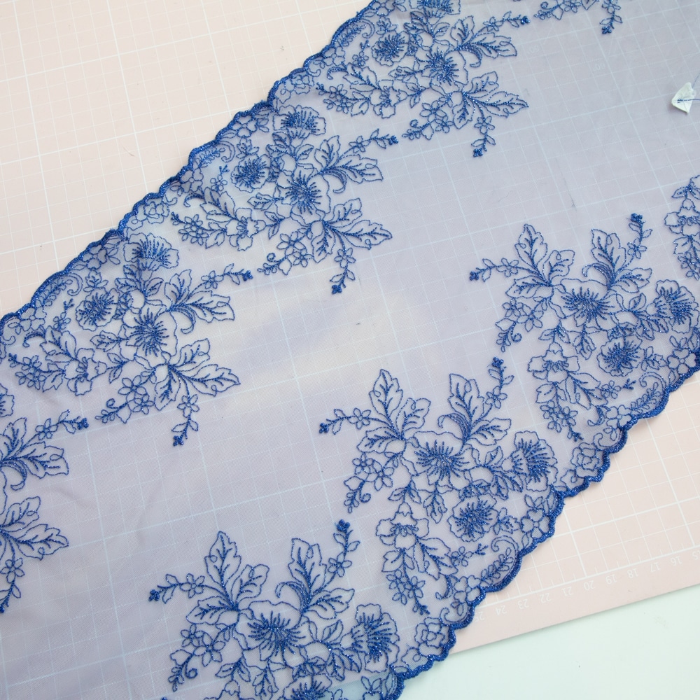 This Midnight Bloom Embroidered Lace is a soft, stretch floral lace in a rich, sapphire blue and shimmer detail. This soft, sheer tulle base is delicately embroidered with a botanical motif and finished with a graceful scalloped edge.