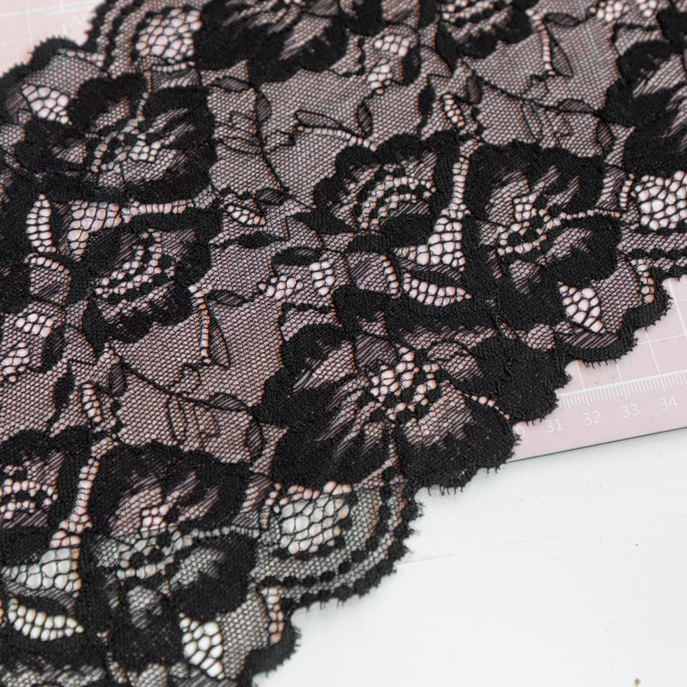 This stretch galloon lace has a black floral base and scalloped edge. A blend of nylon and spandex, it is perfect for projects that need a little bit of stretch.