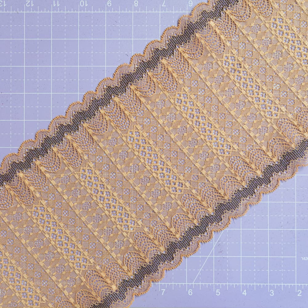 This stretch galloon lace has an elegant geometric design with a scalloped edge that has purple detailing. A blend of nylon and spandex, it is perfect for projects that need a little bit of stretch.