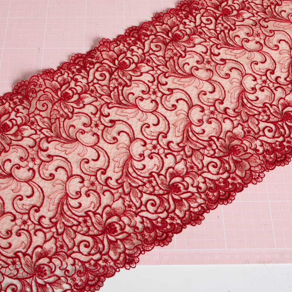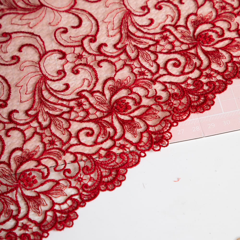 This embroidered tulle features a regal red designed embroidered scallop edge. A beige tulle base adds depth and texture.