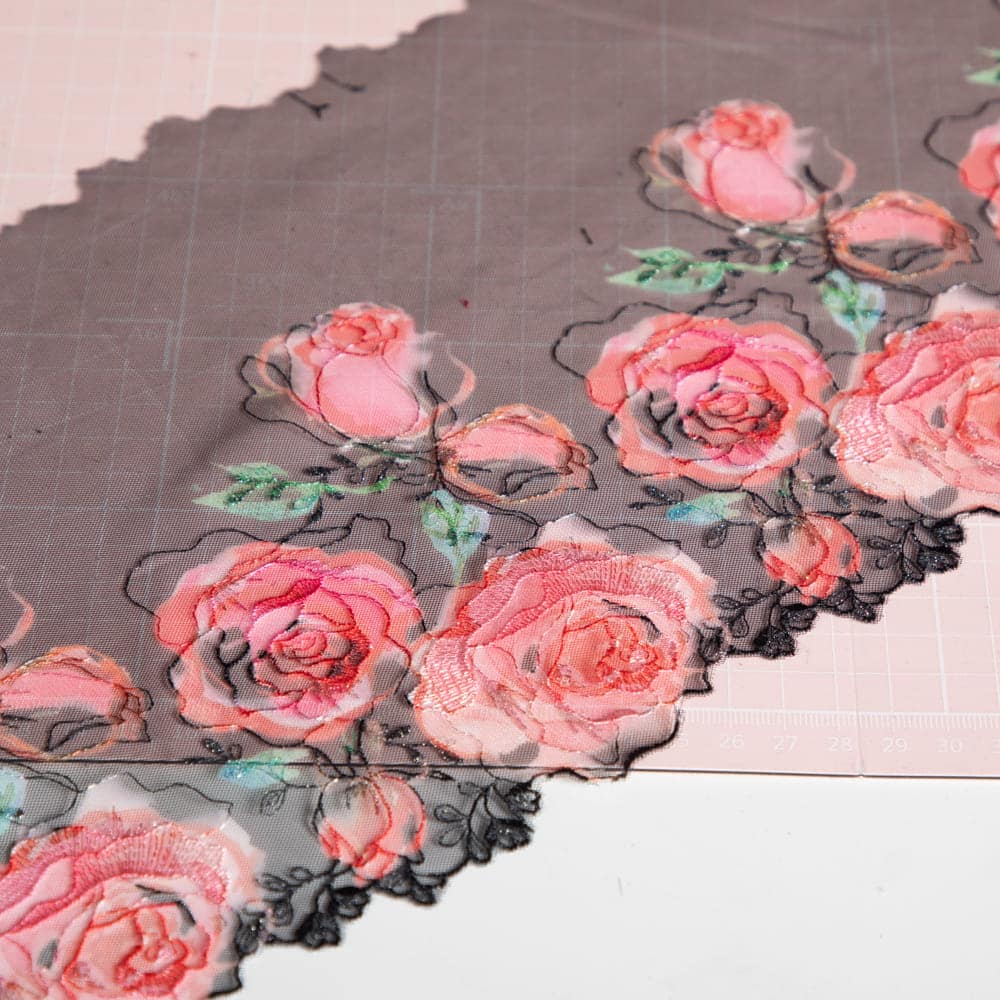 This embroidered tulle is truly one-of-a-kind and designed exclusively for Madalynne -stunning rose printed and rose embroidered tulle. This custom lace has a black tulle base with soft, painterly digital rose design printed on top and accented with dimensional embroidery for added depth and texture. A subtle shimmer is woven throughout, giving a luxe finish.